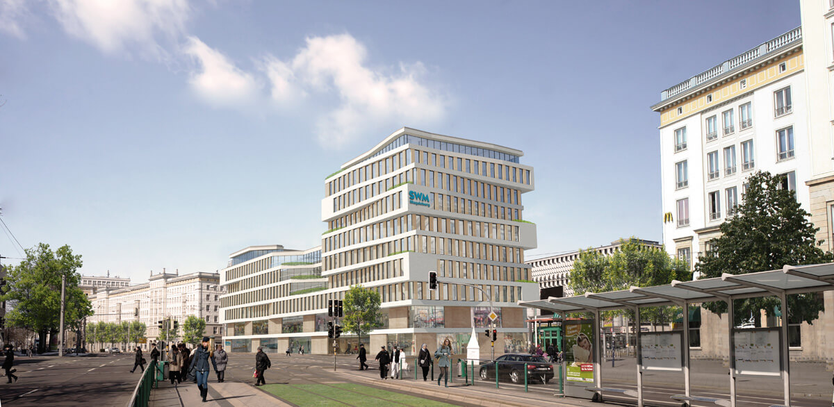 Eine einfache Lochfassade wird zu horizontalen Bändern zusammengefasst. Loggien setzen als Einschnitte baukörperliche Kontrapunkte. Die Staffelung bietet die Möglichkeit in den Obergeschossen Dachterrassen unterzubringen. Warme Mokkatöne schaffen eine private Wohlfühlatmosphäre.