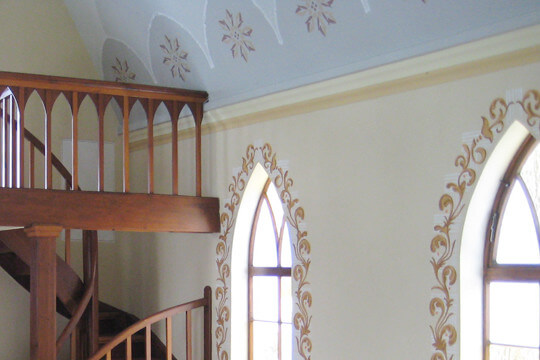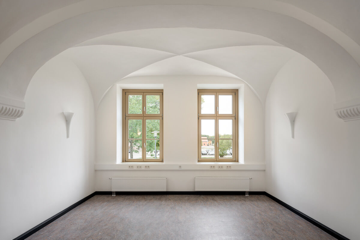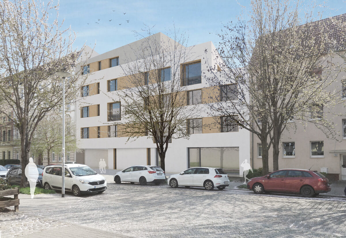 Ein mäandrierender, verputzter Baukörper gliedert das tiefe, innerstätische Grundstück. Es bilden sich Freiräume mit verschiedenen Eigenschaften. Erdgeschossige Durchgänge verknüpfen diese Freiräume miteinander. Mit Hilfe der gestaffelten Geschossigkeit werden Bezüge zur Gründerzeitbebauung an der Straßenseite hergestellt sowie in der Tiefe wird eine Konkurrenz zur umliegenden Hinterhofbebauung vermieden.